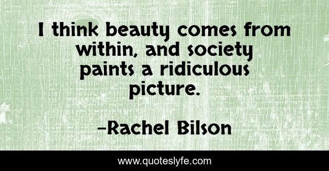 This page presents the quote "I think beauty comes from within, and society paints a ridiculous picture.". Author of this quote is Rachel Bilson. This quote is about society, think, picture,.