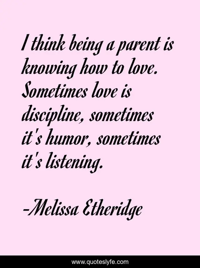 This page presents the quote "I think being a parent is knowing how to love. Sometimes love is discipline, sometimes it's humor, sometimes it's listening.". Author of this quote is Melissa Etheridge. This quote is about love, listening, affection, love is,.