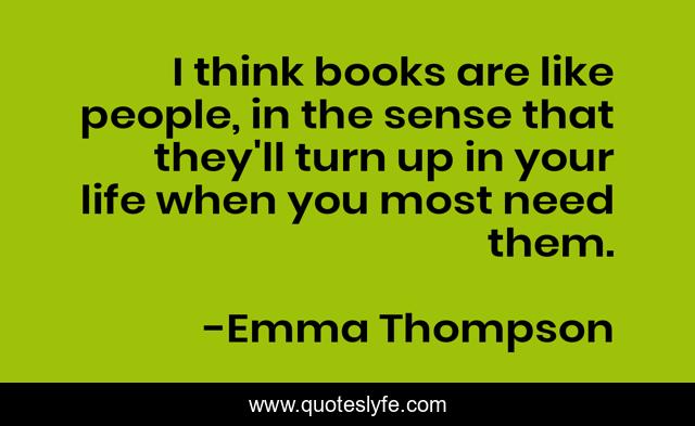 This page presents the quote "I think books are like people, in the sense that they'll turn up in your life when you most need them.". Author of this quote is Emma Thompson. This quote is about books, reading,.