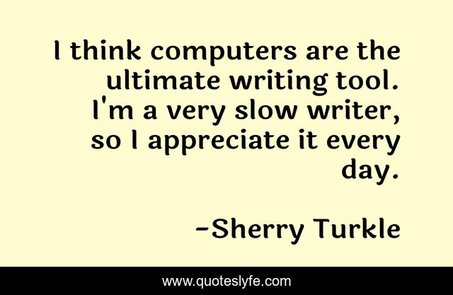 This page presents the quote "I think computers are the ultimate writing tool. I'm a very slow writer, so I appreciate it every day.". Author of this quote is Sherry Turkle. This quote is about writing, think, day,.