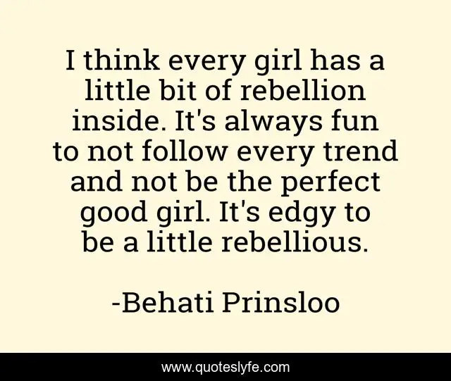 This page presents the quote "I think every girl has a little bit of rebellion inside. It's always fun to not follow every trend and not be the perfect good girl. It's edgy to be a little rebellious.". Author of this quote is Behati Prinsloo. This quote is about fun, girl, rebellion,.
