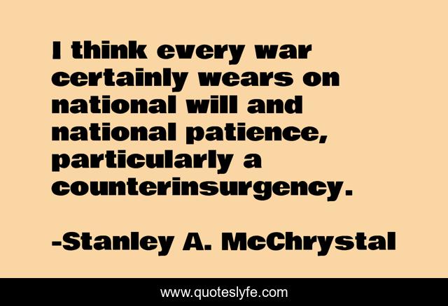 This page presents the quote "I think every war certainly wears on national will and national patience, particularly a counterinsurgency.". Author of this quote is Stanley A. McChrystal. This quote is about war, think,.