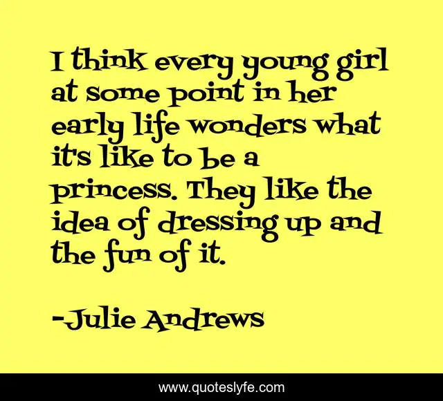 This page presents the quote "I think every young girl at some point in her early life wonders what it's like to be a princess. They like the idea of dressing up and the fun of it.". Author of this quote is Julie Andrews. This quote is about fun, girl, princess,.