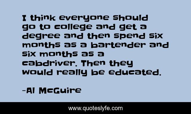 This page presents the quote "I think everyone should go to college and get a degree and then spend six months as a bartender and six months as a cabdriver. Then they would really be educated.". Author of this quote is Al McGuire. This quote is about everyone, college, think,.
