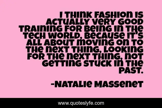 This page presents the quote "I think fashion is actually very good training for being in the tech world, because it's all about moving on to the next thing, looking for the next thing, not getting stuck in the past.". Author of this quote is Natalie Massenet. This quote is about past, training, good,.