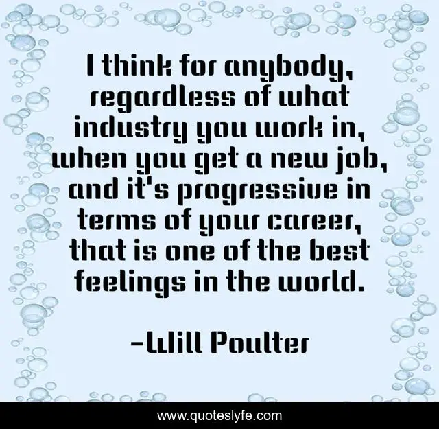 This page presents the quote "I think for anybody, regardless of what industry you work in, when you get a new job, and it's progressive in terms of your career, that is one of the best feelings in the world.". Author of this quote is Will Poulter. This quote is about world, job, best,.