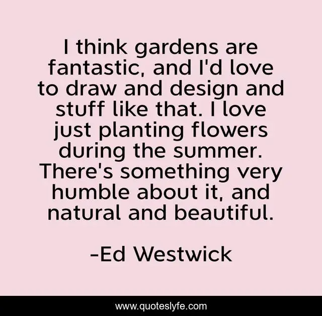 This page presents the quote "I think gardens are fantastic, and I'd love to draw and design and stuff like that. I love just planting flowers during the summer. There's something very humble about it, and natural and beautiful.". Author of this quote is Ed Westwick. This quote is about beautiful, flowers, love, affection,.