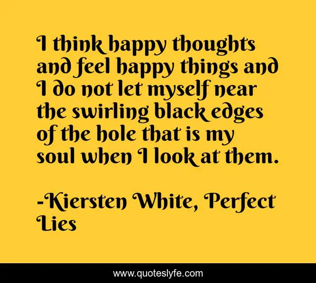 This page presents the quote "I think happy thoughts and feel happy things and I do not let myself near the swirling black edges of the hole that is my soul when I look at them.". Author of this quote is Kiersten White, Perfect Lies. This quote is about broken, fia,.