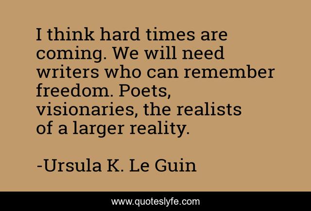 This page presents the quote "I think hard times are coming. We will need writers who can remember freedom. Poets, visionaries, the realists of a larger reality.". Author of this quote is Ursula K. Le Guin. This quote is about 2014-national-book-awards, speech,.