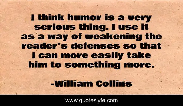 This page presents the quote "I think humor is a very serious thing. I use it as a way of weakening the reader's defenses so that I can more easily take him to something more.". Author of this quote is William Collins. This quote is about i can, think, way,.