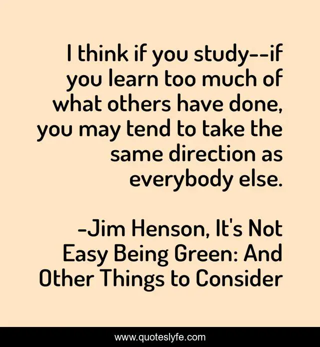 This page presents the quote "I think if you study--if you learn too much of what others have done, you may tend to take the same direction as everybody else.". Author of this quote is Jim Henson, It's Not Easy Being Green: And Other Things to Consider. This quote is about studying, creativity, learning, innovation,.