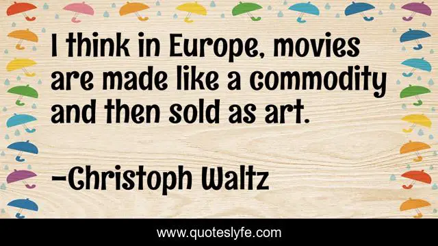 This page presents the quote "I think in Europe, movies are made like a commodity and then sold as art.". Author of this quote is Christoph Waltz. This quote is about art, think, like,.