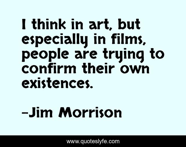 This page presents the quote "I think in art, but especially in films, people are trying to confirm their own existences.". Author of this quote is Jim Morrison. This quote is about trying, think, people,.