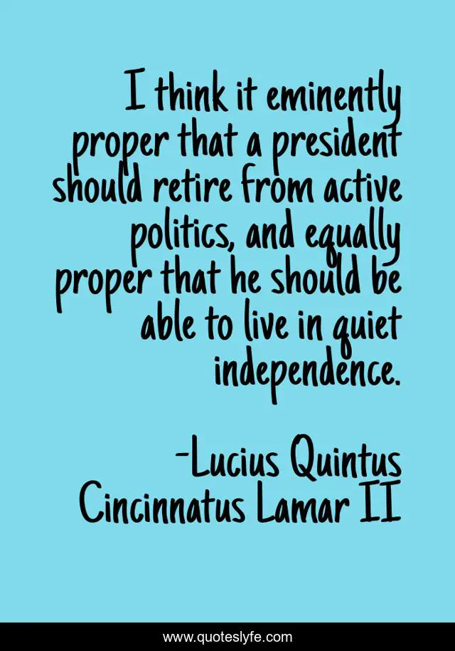 This page presents the quote "I think it eminently proper that a president should retire from active politics, and equally proper that he should be able to live in quiet independence.". Author of this quote is Lucius Quintus Cincinnatus Lamar II. This quote is about politics, live, think,.