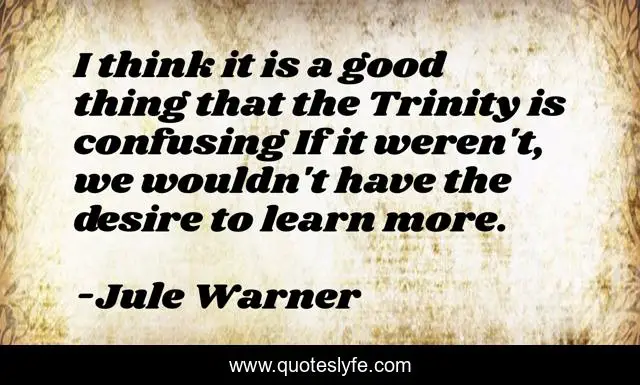 This page presents the quote "I think it is a good thing that the Trinity is confusing If it weren't, we wouldn't have the desire to learn more.". Author of this quote is Jule Warner. This quote is about confusion, curiosity, trinity,.
