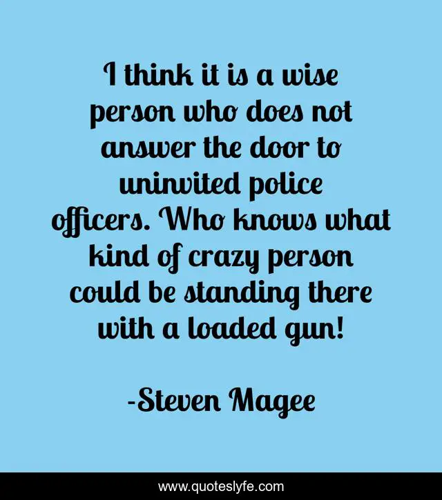 This page presents the quote "I think it is a wise person who does not answer the door to uninvited police officers. Who knows what kind of crazy person could be standing there with a loaded gun!". Author of this quote is Steven Magee. This quote is about crazy, police, policeman, wise-sayings, police-state, policemen, gun-violence, wise-words, wisdom,.