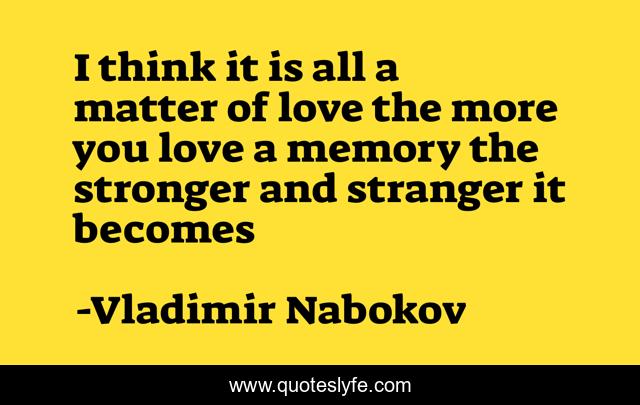 This page presents the quote "I think it is all a matter of love the more you love a memory the stronger and stranger it becomes". Author of this quote is Vladimir Nabokov. This quote is about love, recollection, infatuation, memory, remembrance, affection,.