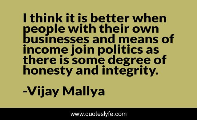 This page presents the quote "I think it is better when people with their own businesses and means of income join politics as there is some degree of honesty and integrity.". Author of this quote is Vijay Mallya. This quote is about integrity, honesty, people,.