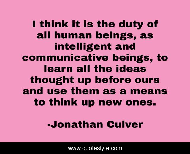 This page presents the quote "I think it is the duty of all human beings, as intelligent and communicative beings, to learn all the ideas thought up before ours and use them as a means to think up new ones.". Author of this quote is Jonathan Culver. This quote is about communication, humans, ideas, meaning, learning, intelligence, human-beings,.