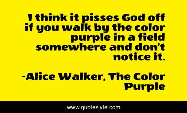 This page presents the quote "I think it pisses God off if you walk by the color purple in a field somewhere and don't notice it.". Author of this quote is Alice Walker, The Color Purple. This quote is about color, god, purple, religion,.