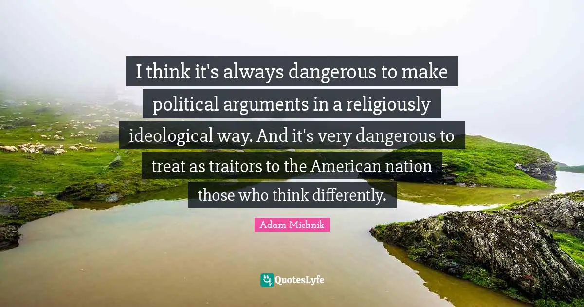 This page presents the quote "I think it's always dangerous to make political arguments in a religiously ideological way. And it's very dangerous to treat as traitors to the American nation those who think differently.". Author of this quote is Adam Michnik. This quote is about way, dangerous, thinking, political, ideological,.