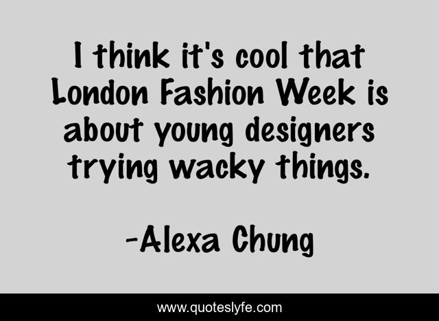 This page presents the quote "I think it's cool that London Fashion Week is about young designers trying wacky things.". Author of this quote is Alexa Chung. This quote is about week, fashion, think,.
