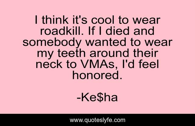 This page presents the quote "I think it's cool to wear roadkill. If I died and somebody wanted to wear my teeth around their neck to VMAs, I'd feel honored.". Author of this quote is Ke$ha. This quote is about death, animals, fashion, roadkill,.