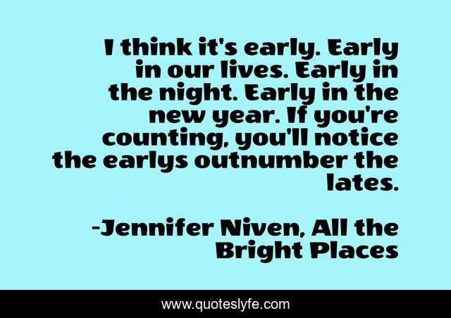 This page presents the quote "I think it's early. Early in our lives. Early in the night. Early in the new year. If you're counting, you'll notice the earlys outnumber the lates.". Author of this quote is Jennifer Niven, All the Bright Places. This quote is about enthusiasm, philosophical, inspirational,.