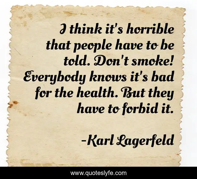 This page presents the quote "I think it's horrible that people have to be told. Don't smoke! Everybody knows it's bad for the health. But they have to forbid it.". Author of this quote is Karl Lagerfeld. This quote is about bad, think, people,.