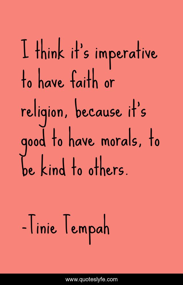 This page presents the quote "I think it's imperative to have faith or religion, because it's good to have morals, to be kind to others.". Author of this quote is Tinie Tempah. This quote is about faith, good, be kind,.