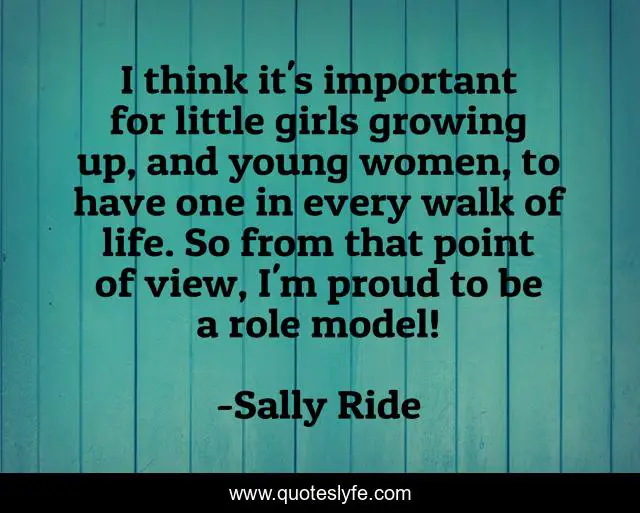 This page presents the quote "I think it's important for little girls growing up, and young women, to have one in every walk of life. So from that point of view, I'm proud to be a role model!". Author of this quote is Sally Ride. This quote is about little girls, life, walk,.