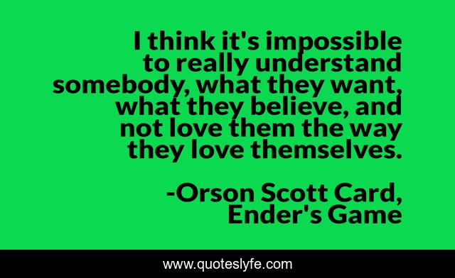 This page presents the quote "I think it's impossible to really understand somebody, what they want, what they believe, and not love them the way they love themselves.". Author of this quote is Orson Scott Card, Ender's Game. This quote is about people, truth, wisdom,.