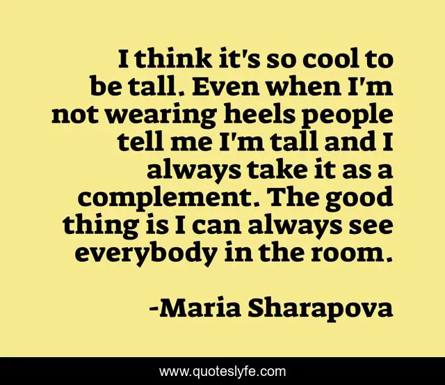 This page presents the quote "I think it's so cool to be tall. Even when I'm not wearing heels people tell me I'm tall and I always take it as a complement. The good thing is I can always see everybody in the room.". Author of this quote is Maria Sharapova. This quote is about me, good, people,.