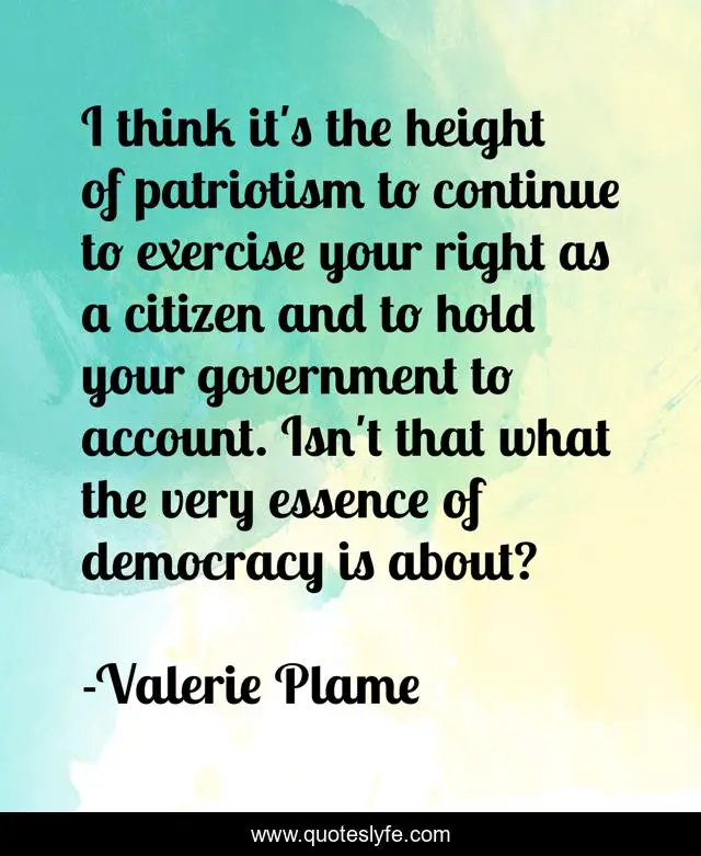 This page presents the quote "I think it's the height of patriotism to continue to exercise your right as a citizen and to hold your government to account. Isn't that what the very essence of democracy is about?". Author of this quote is Valerie Plame. This quote is about democracy, government,.