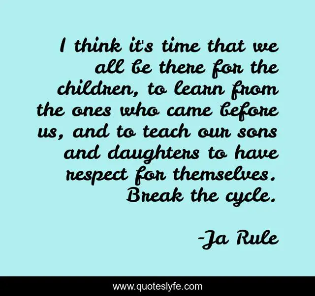 This page presents the quote "I think it's time that we all be there for the children, to learn from the ones who came before us, and to teach our sons and daughters to have respect for themselves. Break the cycle.". Author of this quote is Ja Rule. This quote is about time, think, children,.
