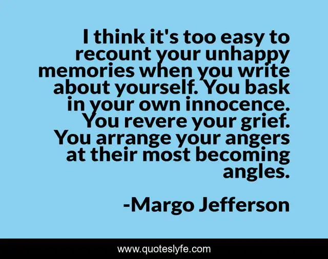This page presents the quote "I think it's too easy to recount your unhappy memories when you write about yourself. You bask in your own innocence. You revere your grief. You arrange your angers at their most becoming angles.". Author of this quote is Margo Jefferson. This quote is about grief, memories, yourself,.