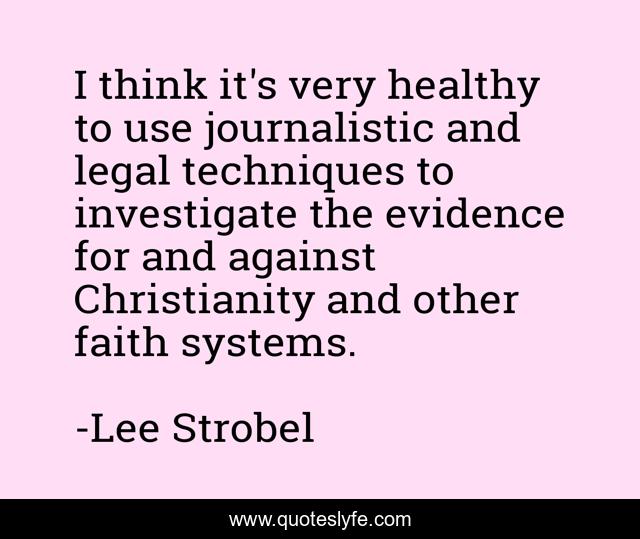 This page presents the quote "I think it's very healthy to use journalistic and legal techniques to investigate the evidence for and against Christianity and other faith systems.". Author of this quote is Lee Strobel. This quote is about healthy, faith, think,.