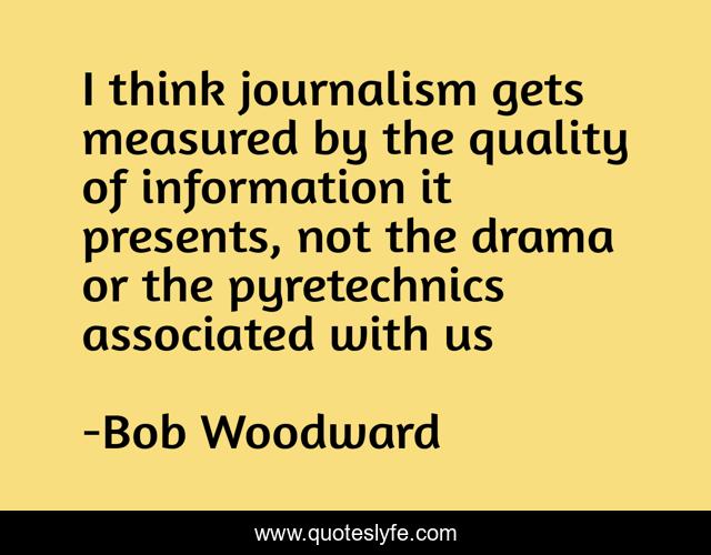 This page presents the quote "I think journalism gets measured by the quality of information it presents, not the drama or the pyretechnics associated with us". Author of this quote is Bob Woodward. This quote is about drama, journalism, quality,.