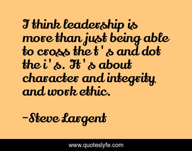 This page presents the quote "I think leadership is more than just being able to cross the t's and dot the i's. It's about character and integrity and work ethic.". Author of this quote is Steve Largent. This quote is about leadership, integrity,.