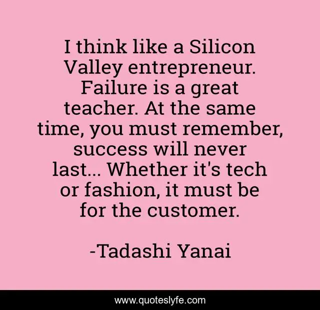 This page presents the quote "I think like a Silicon Valley entrepreneur. Failure is a great teacher. At the same time, you must remember, success will never last... Whether it's tech or fashion, it must be for the customer.". Author of this quote is Tadashi Yanai. This quote is about failure, success, time,.