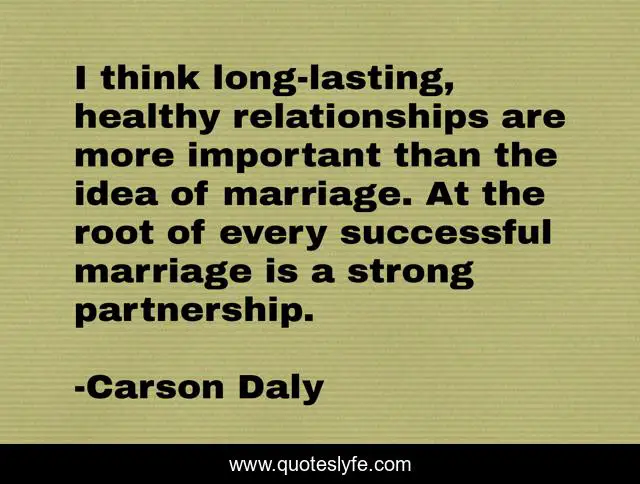 This page presents the quote "I think long-lasting, healthy relationships are more important than the idea of marriage. At the root of every successful marriage is a strong partnership.". Author of this quote is Carson Daly. This quote is about healthy, strong, marriage,.