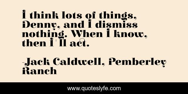 This page presents the quote "I think lots of things, Denny, and I dismiss nothing. When I know, then I'll act.". Author of this quote is Jack Caldwell, Pemberley Ranch. This quote is about facts-and-ideas, actions, considering-all-options,.