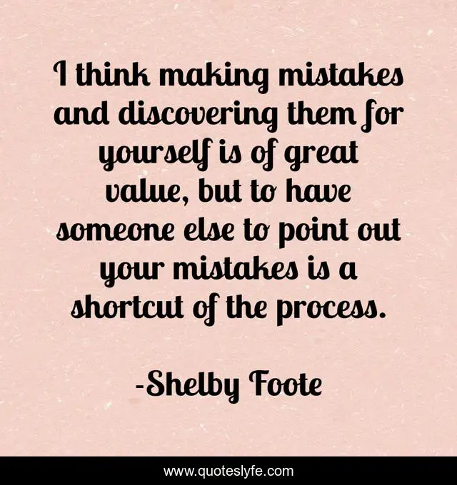 This page presents the quote "I think making mistakes and discovering them for yourself is of great value, but to have someone else to point out your mistakes is a shortcut of the process.". Author of this quote is Shelby Foote. This quote is about mistakes, self-reflection,.