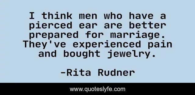 This page presents the quote "I think men who have a pierced ear are better prepared for marriage. They've experienced pain and bought jewelry.". Author of this quote is Rita Rudner. This quote is about men, pain, jewelry,.