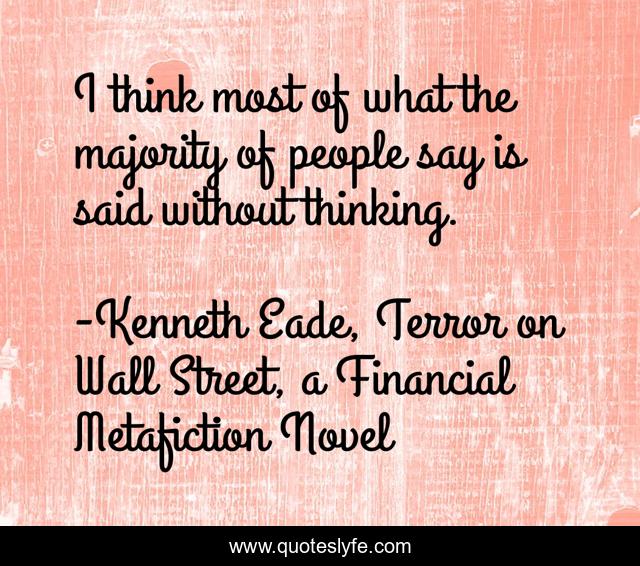 This page presents the quote "I think most of what the majority of people say is said without thinking.". Author of this quote is Kenneth Eade, Terror on Wall Street, a Financial Metafiction Novel. This quote is about thinking, speaking, speaking-without-thinking,.
