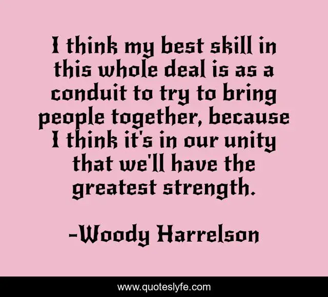 This page presents the quote "I think my best skill in this whole deal is as a conduit to try to bring people together, because I think it's in our unity that we'll have the greatest strength.". Author of this quote is Woody Harrelson. This quote is about unity, best, together,.
