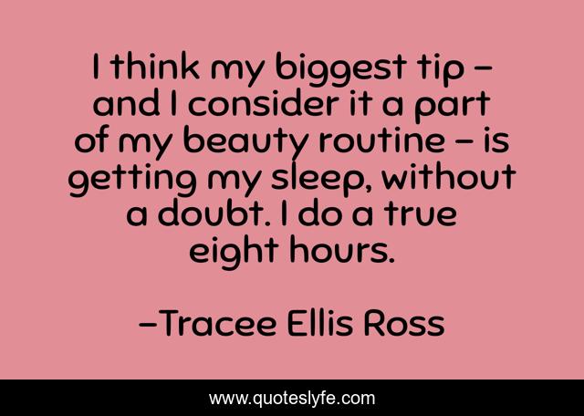 This page presents the quote "I think my biggest tip - and I consider it a part of my beauty routine - is getting my sleep, without a doubt. I do a true eight hours.". Author of this quote is Tracee Ellis Ross. This quote is about doubt, sleep, think,.