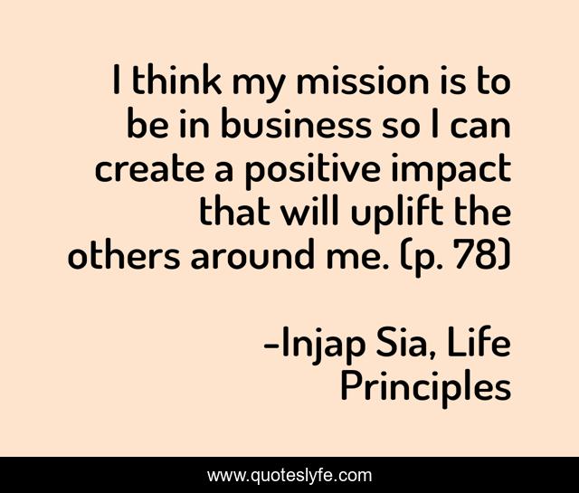 This page presents the quote "I think my mission is to be in business so I can create a positive impact that will uplift the others around me. (p. 78)". Author of this quote is Injap Sia, Life Principles. This quote is about passion, business, success,.