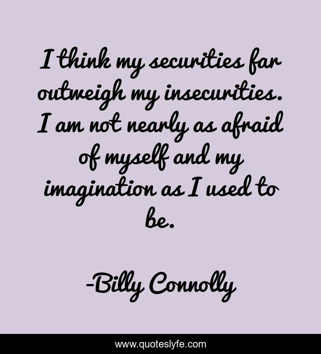 This page presents the quote "I think my securities far outweigh my insecurities. I am not nearly as afraid of myself and my imagination as I used to be.". Author of this quote is Billy Connolly. This quote is about myself, think,.