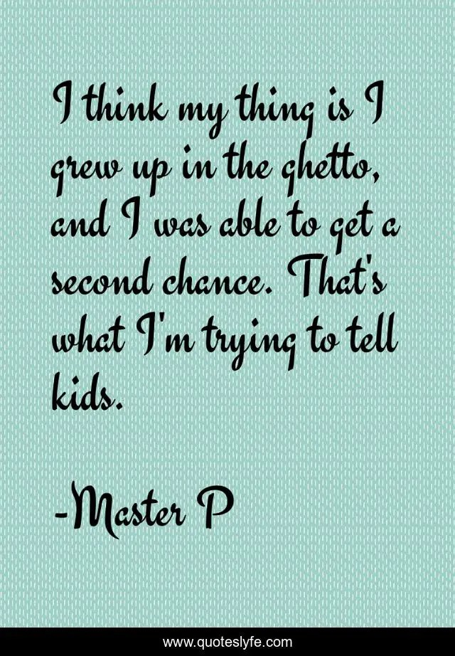 This page presents the quote "I think my thing is I grew up in the ghetto, and I was able to get a second chance. That's what I'm trying to tell kids.". Author of this quote is Master P. This quote is about trying, second chance, think,.